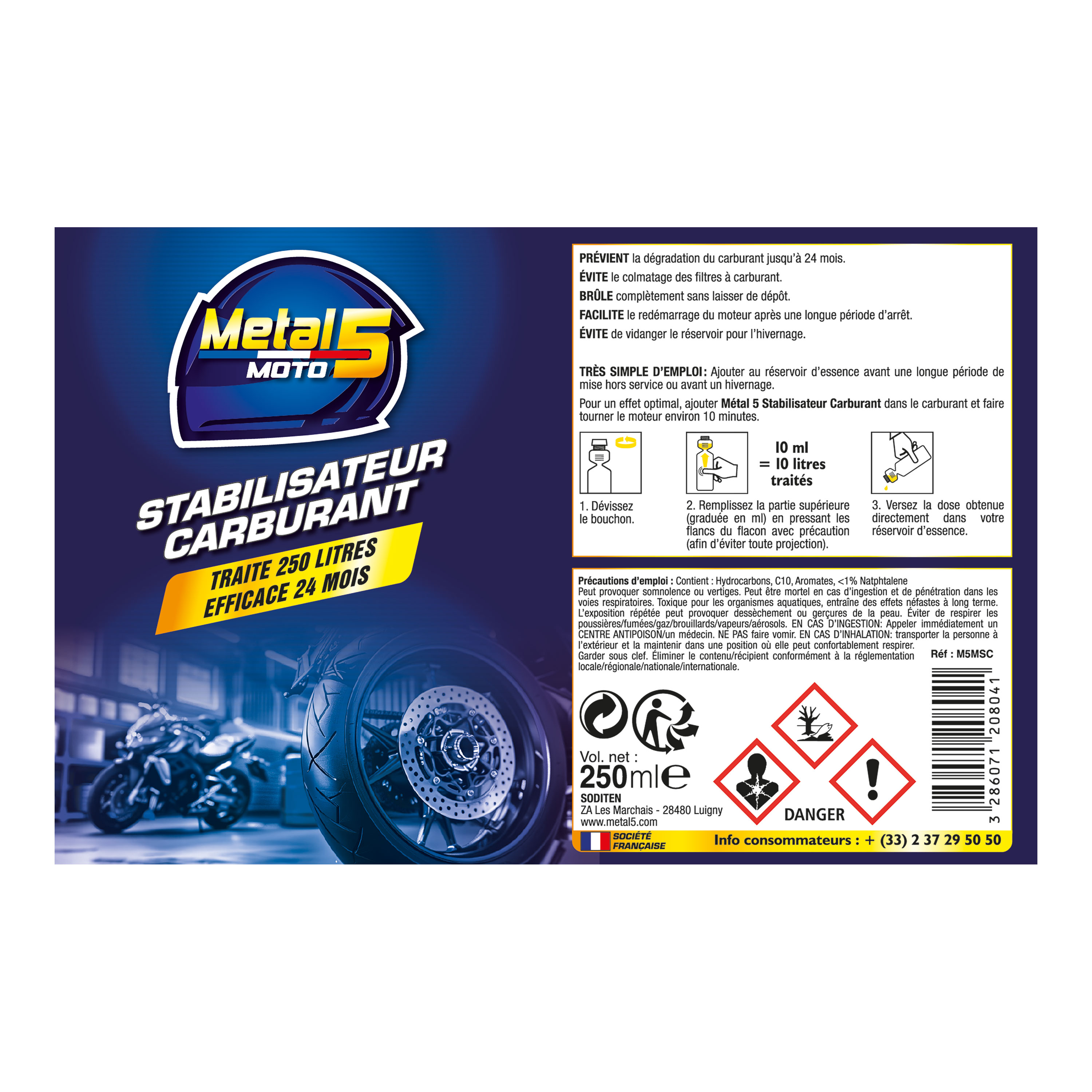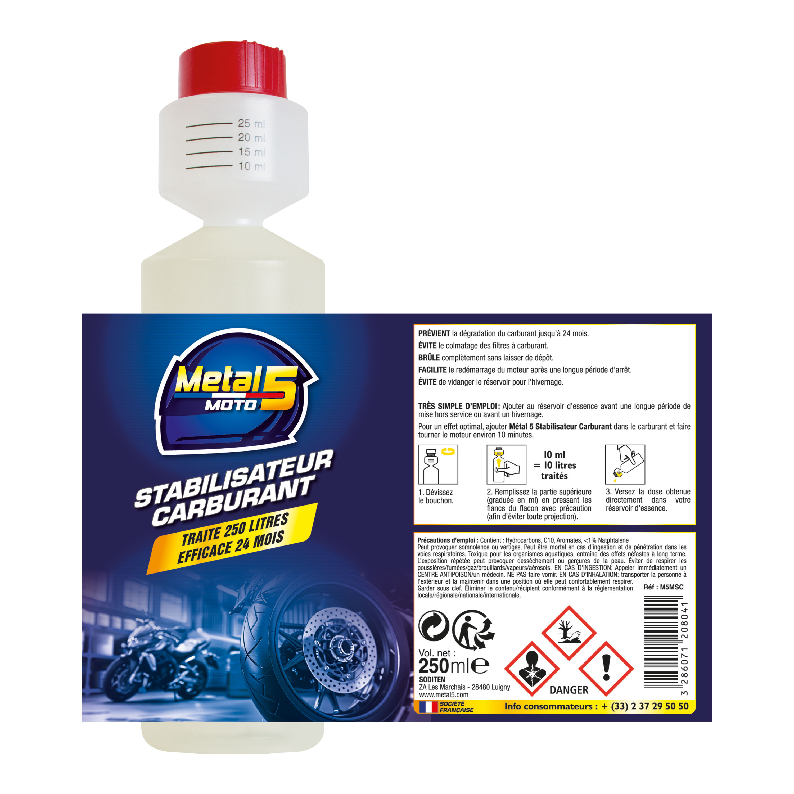 Pour un effet optimal, ajouter Métal 5 Stabilisateur Carburant dans le carburant et faire tourner le moteur environ 10 minutes.